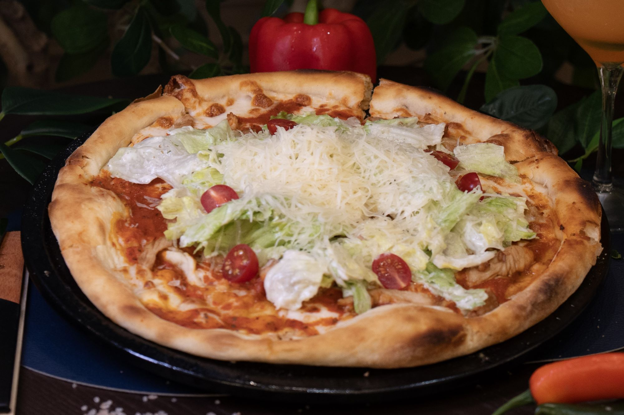 Toyuq, romaine kahı, parmesan pendiri,...