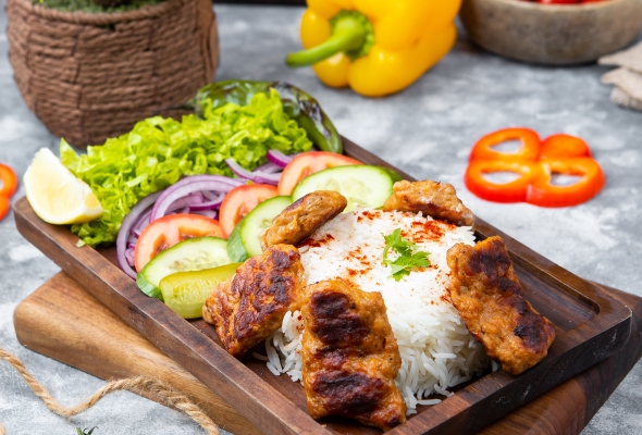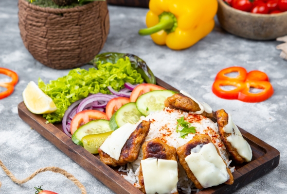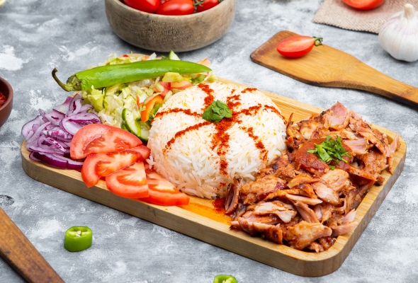 Toyuq əti, Düyü, Pomidor, Xiyar,...