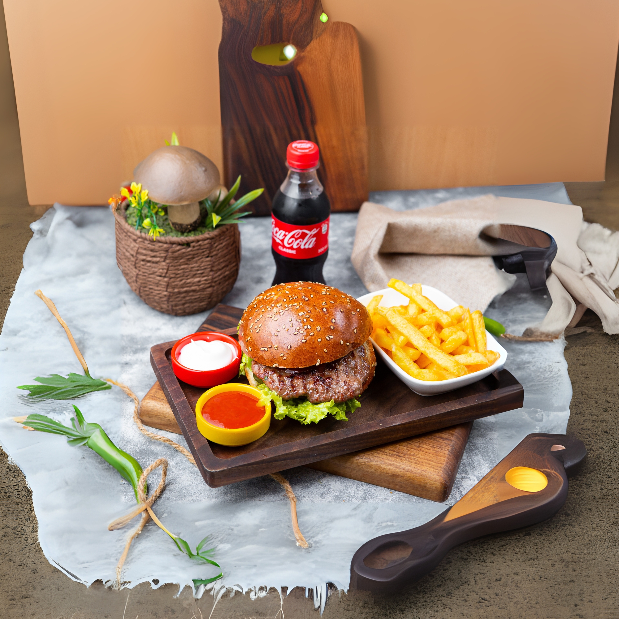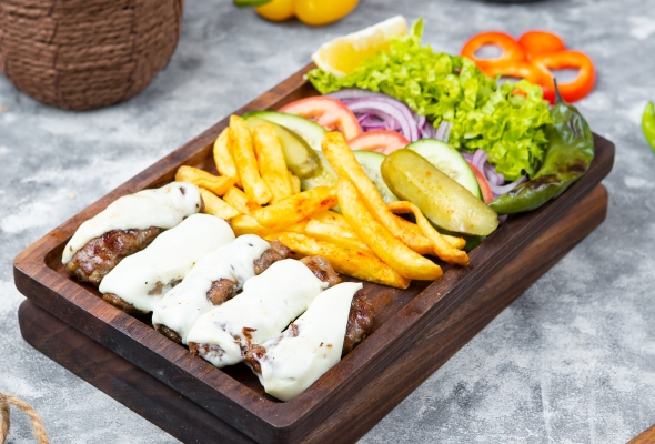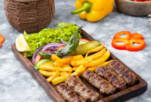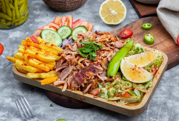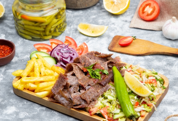 Dana əti, Salat, Acı bibər, Fries,...